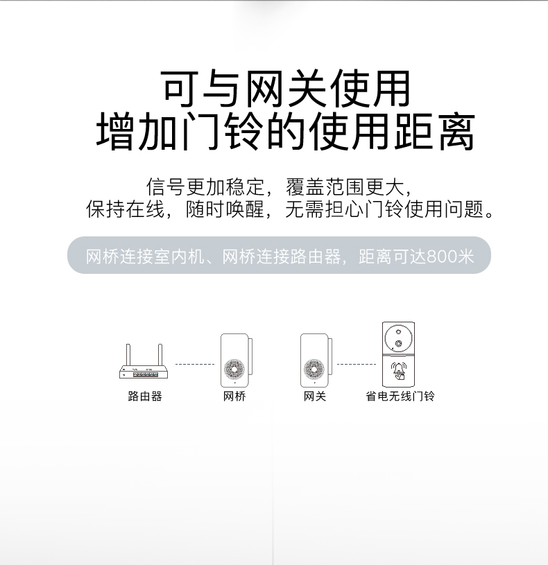 嘉松无线网桥/网关/中继器,可分别搭配嘉松无线可视门铃、电子猫眼、高清摄像头使用;拥有一台无线网关,搭配的电子产品网络都稳定不掉线,独立的存储功能(TF卡),录像存储安全有保障,同时能省去每年购买的云服务的存储功能的费用,且低功耗非常省电,你值得拥有!